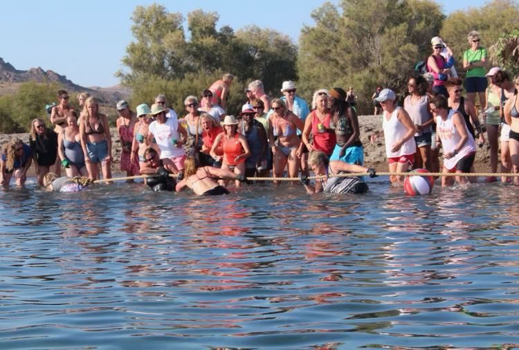 Bijvoorbeeld touwtrekken in het water. Een hilarisch competitief spektakel